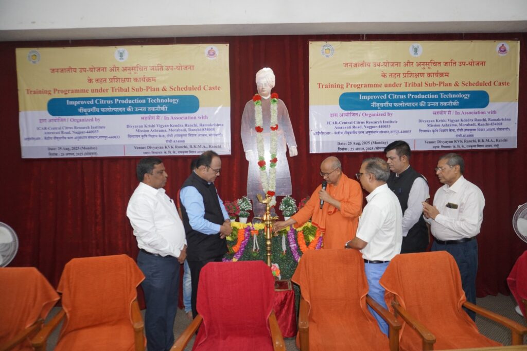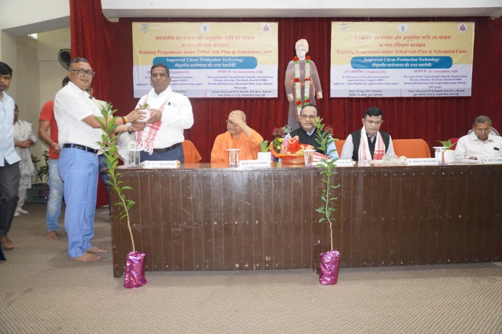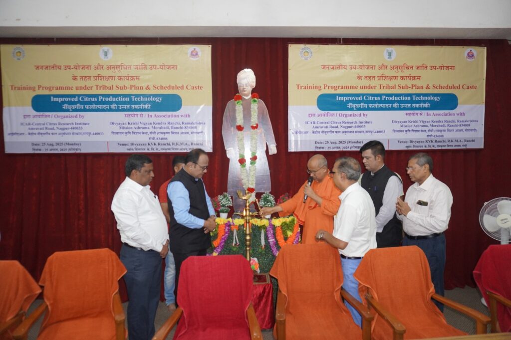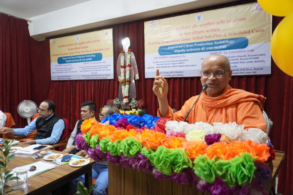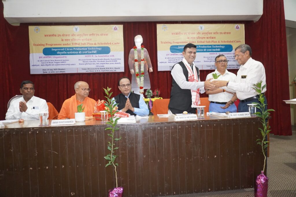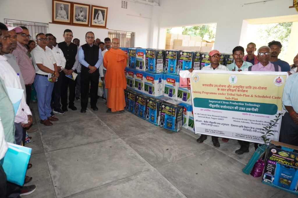 आज दिनांक 25 अगस्त को दिव्यायन कृषि विज्ञान केन्द्र, रामकृष्ण मिशन आश्रम, मोराबादी, रांची में आई.सी.ए.आर. – केन्द्रीय निम्बू वर्गीय फल अनुसंधान संस्थान नागपुर (महाराष्ट्र) के द्वारा एक दिवसीय प्रशिक्षण तथा 6250 कागजी निम्बू, 150 मौसम्बी, 100 संतरा तथा 250 बैटरी आपरेटेड स्प्रयेर का वितरण 200 एस.टी. तथा 50 एस.सी. किसानों के बीच किया गया साथ ही साथ निम्बू वर्गीय फलों (निम्बू, संतरा, मौसम्बी) का डेमो गेतालसुद के.वी.के. फार्म में किया गया| इस कार्यक्रम में 298 किसानों ने भाग लिया|