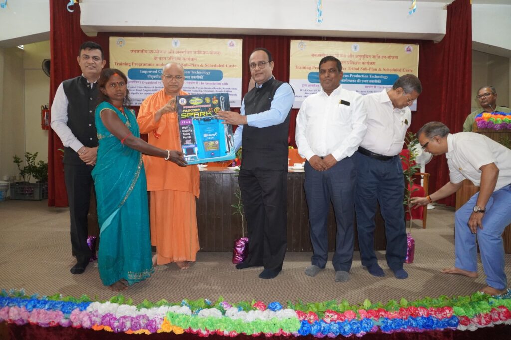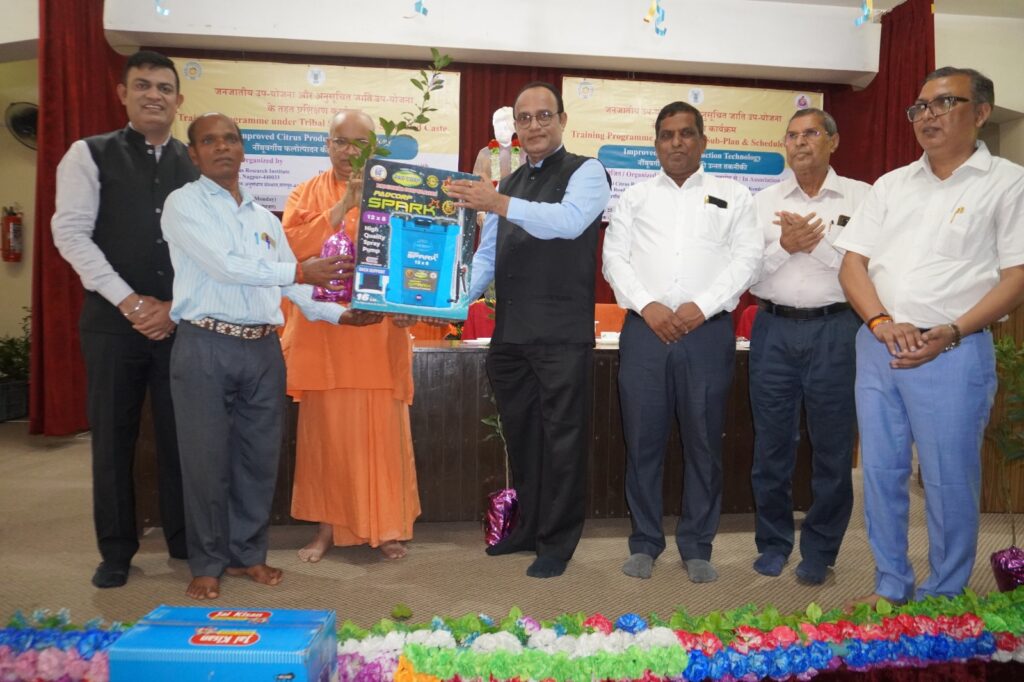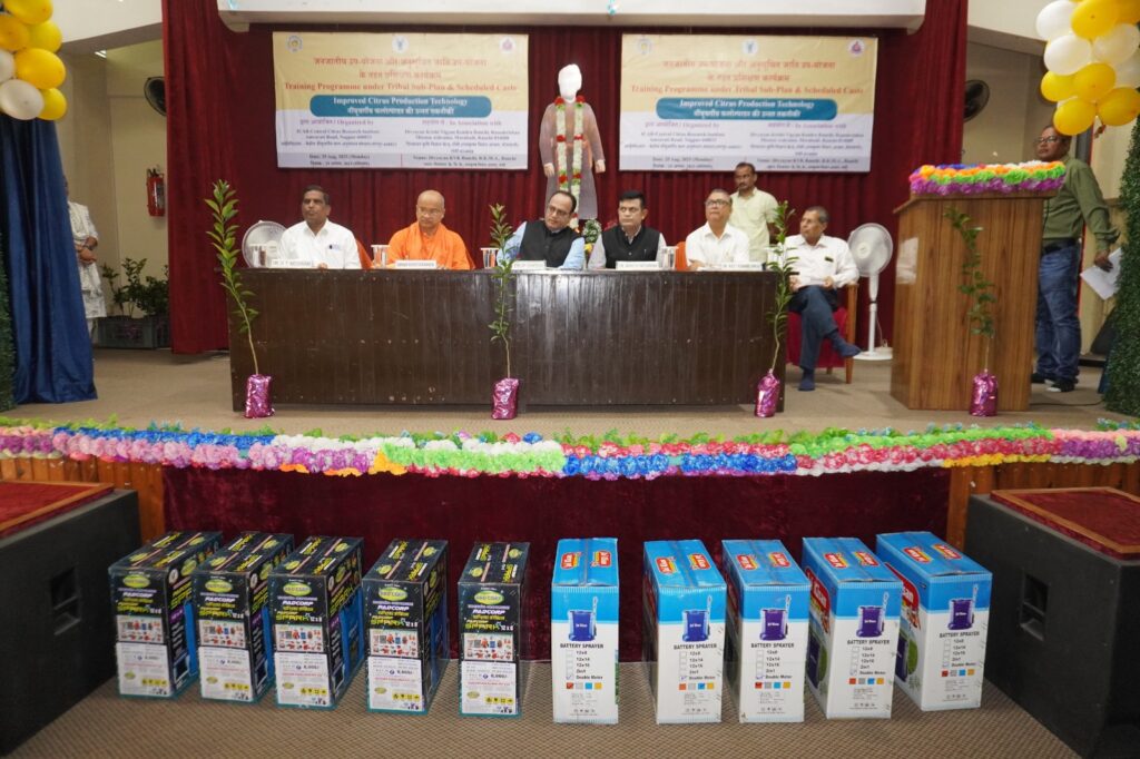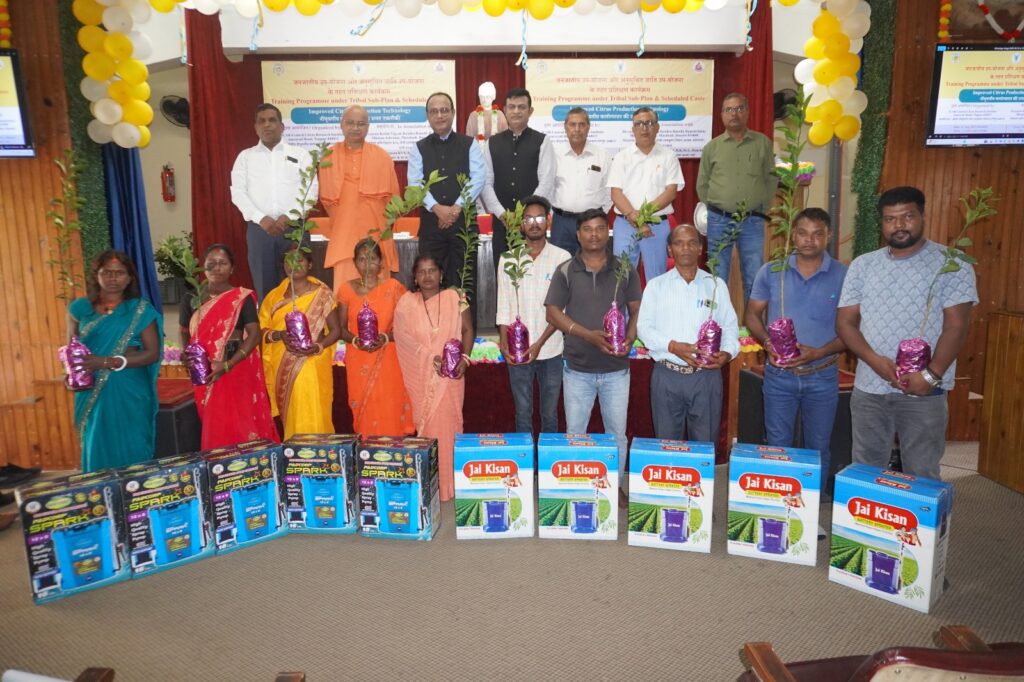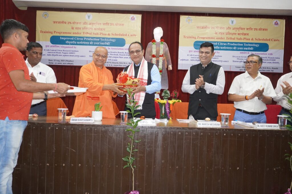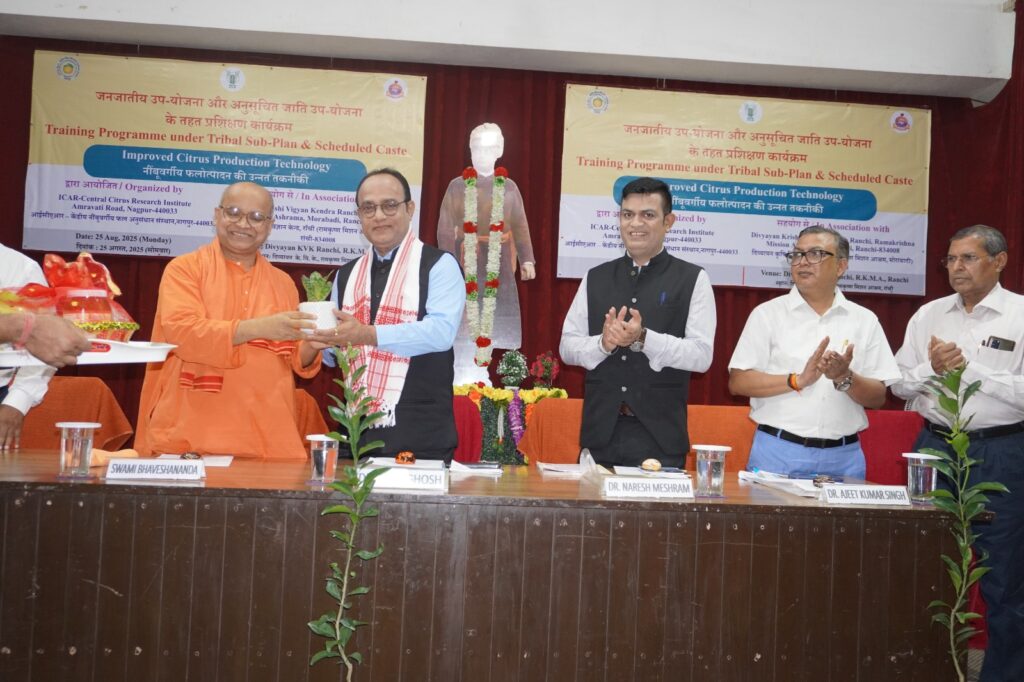 आज दिनांक 25 अगस्त को दिव्यायन कृषि विज्ञान केन्द्र, रामकृष्ण मिशन आश्रम, मोराबादी, रांची में आई.सी.ए.आर. – केन्द्रीय निम्बू वर्गीय फल अनुसंधान संस्थान नागपुर (महाराष्ट्र) के द्वारा एक दिवसीय प्रशिक्षण तथा 6250 कागजी निम्बू, 150 मौसम्बी, 100 संतरा तथा 250 बैटरी आपरेटेड स्प्रयेर का वितरण 200 एस.टी. तथा 50 एस.सी. किसानों के बीच किया गया साथ ही साथ निम्बू वर्गीय फलों (निम्बू, संतरा, मौसम्बी) का डेमो गेतालसुद के.वी.के. फार्म में किया गया| इस कार्यक्रम में 298 किसानों ने भाग लिया|