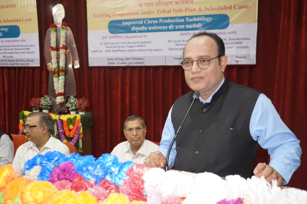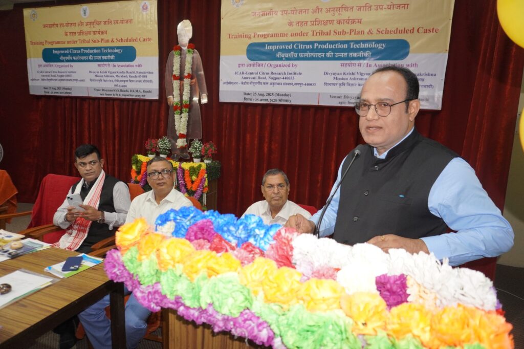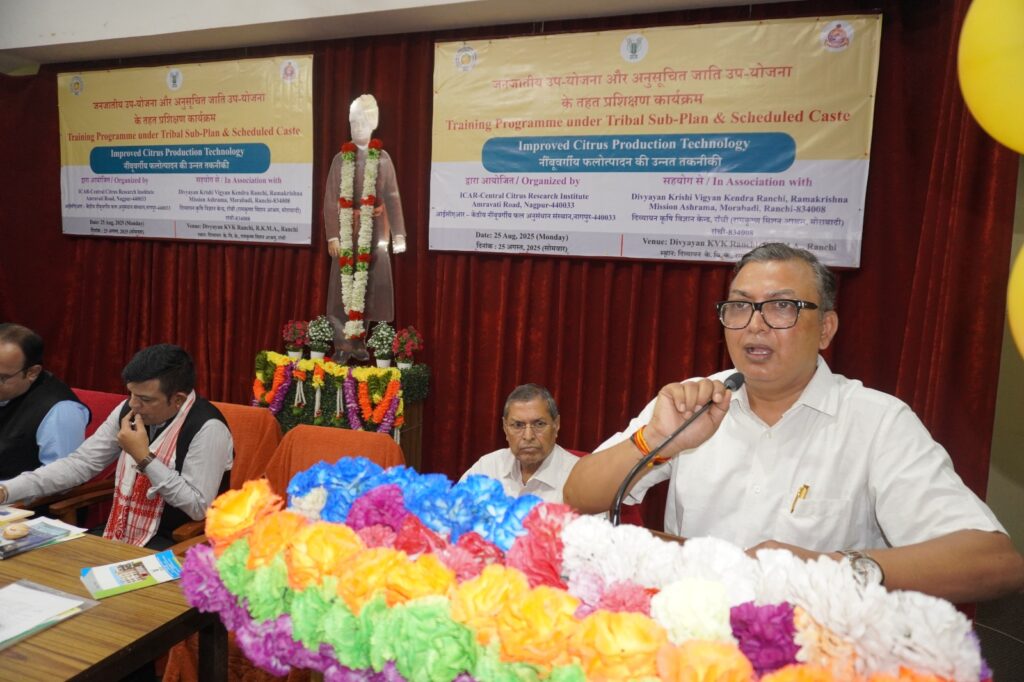 मुख्य अतिथि ने सभा को संबोधित करते हुए किसान भाइयों को बतलाया की हम 2047 तक भारत को समृद्ध करने के संकल्प को साकार करने हेतु विकसित कृषि/हॉर्टिकल्चर को आगे बढाने के लिए हम सभी को समेकित कृषि प्रणाली तथा फसल विविधिकरण को अच्छे से अपनाना होगा| निम्बू वर्गीय फसलों की झारखंड में काफी संभावनाएं है| निम्बूवर्गीय फसल को अपनाकर हम सभी झारखंड को समृद्ध कर सकेंगे| अभी विगत 11 वर्षों में भारत सरकार की 70 विभिन्न योजनायें किसानों के लिए चल रही है| इसका किसान भाई अधिक से अधिक फायदा लें|